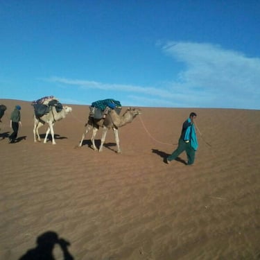 Día 2: Desierto Salvaje: Salida 08 a.m. rumbo a Erg Chegaga. Después de tres horas de caminata, almuerzo en Nkhal Race, 15:00 h salida hacia Oued Naam, 2 horas de caminata. Montaremos el campamento y prepararemos la cena junto a las hermosas dunas.